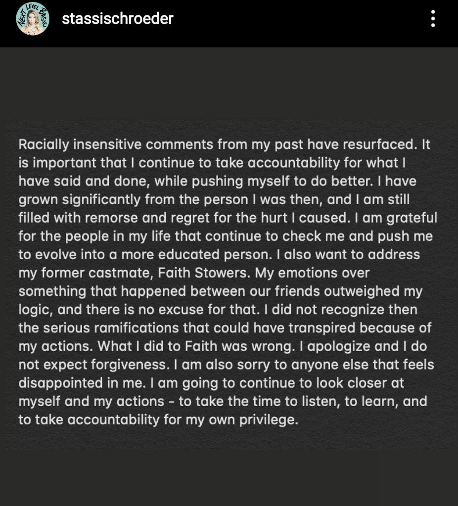 I want to speak to other white women now, because I think you might have been feeling the way that I feel about Stassi Schroeder about a lot of things right now. All the sudden, things that we’ve considered harmless or holding no ill intent, they’re not ok anymore. We can’t say things that we used to say, we have to start doing things differently, and we can’t support things we used to love. It’s really confusing, and we need to acknowledge that. If you loved someone and one day you found out that they had a bunch of bodies buried in the backyard, you can’t love them anymore and you know that. But it doesn’t mean it doesn’t hurt.